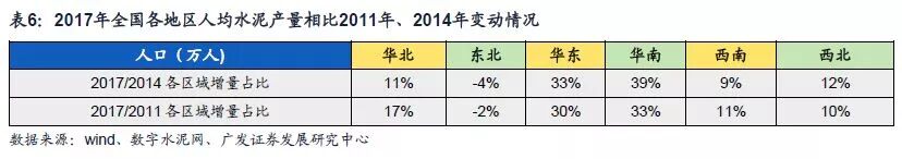 人均水泥消费量不是主要影响变量,我们可以反观下人口这个变量(水泥需求=人均需求*人口数量),从逻辑角度来看,水泥需求主要源自地产和基建两个需求,人口增加带来买房需求增加从而推动地产投资需求,并通过土地出让和税收效应增加财政收入间接推动基建投资需求,反之亦然。从实际数据来看,我们可以看到2017年人口相比2014、2011年的增量贡献中,华南贡献最大、其次是华东,这两个区域对应水泥中长期需求也较好;而东北是唯一负贡献(人口净流出)地区,对应中长期水泥需求也最差;西南、西北、华北贡献度差不多,不过其水泥需求变化趋势差异较大,我们可以从行业微观层面做出合理解释,华北地区水泥产量大幅下滑是从2014年开始,并一直持续到现在,主要受京津冀环保重压、山西内蒙经济结构调整供给侧改革、北方地区错峰生产等因素影响,西北地区水泥产量2015年开始较大下滑,主要受错峰生产影响(后文我们将详细分析)。