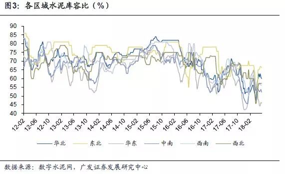 从2018年以来高频数据来看,首先,需求端保持较强的韧性,尤其是西南、华南需求表现较好,华东地区需求也较平稳,地产低库存态势使得地产端需求波动减弱;其次,在高水泥价格、高ROE的情况下,行业供给仍保持边际收缩态势,错峰生产、环保停产和协同停产,预计2018年前三季度行业供给收缩比2017年同期更大;再次,由于需求平稳+供给收缩,行业动态供需关系的库容比数据一直在绝对值较低水平,水泥价格保持高位震荡。